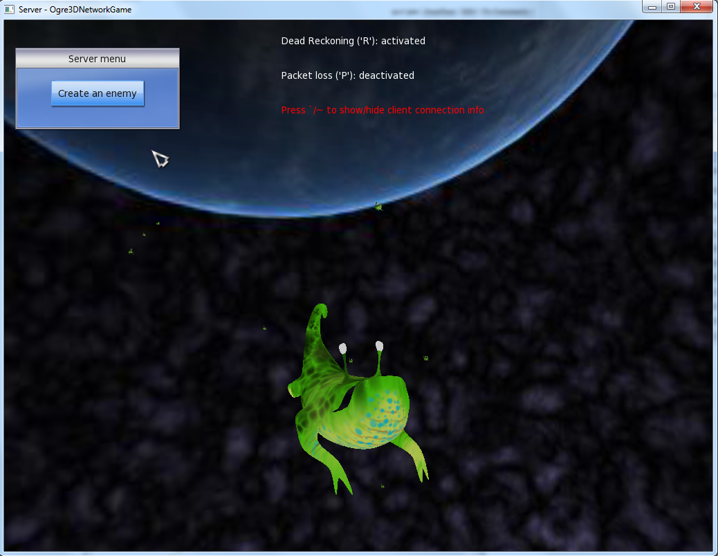The game is based on a client-server protocol. There are two executable files generated by the framework called server.exe and client.exe which are the server and client modules of the game respectively. The server.exe file functions as the host for the game. This file must be run before trying to connect clients. A very simple GUI has been implemented for the server with options to start the server, spawn enemies and also activate and deactivate Dead Reckoning (DR) algorithm. There is also an option to activate and deactivate the simulation of packet loss to further observe the effects of DR. A very simple “God Mode” is also implemented to the server module to enable the user to freely observe the game world in real-time.